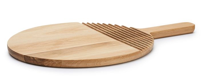 Ek. Generös rund skärbräda i ek. Med väl genomtänkta detaljer. Ett gediget handtag för servering som ligger bra i handen. Skåror som är en kombination av både en visuell detalj och en funktion, de fungerar för att lägga verktyg på så att de ej glider av för enkelt.