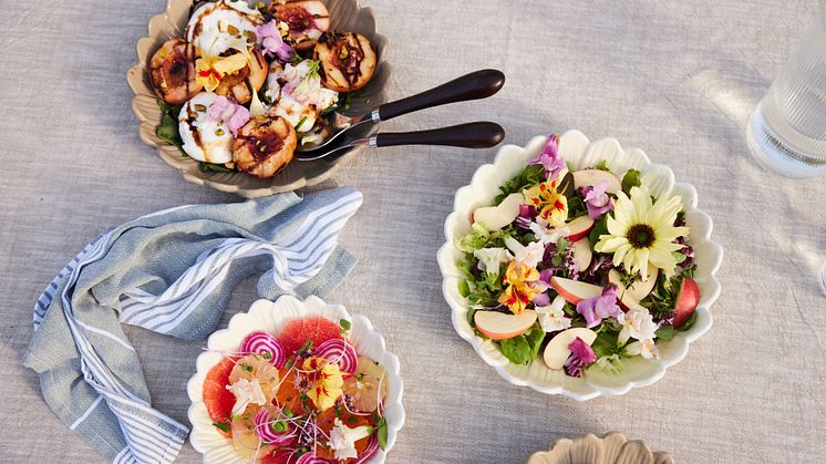 Vi är vana att se blommor på dukade bord, men då som fagra blomsterbuketter eller tryckta på servetter och textilier. Dagny får oss att välja blommor på ett helt nytt sätt.