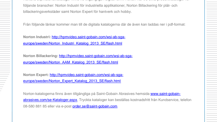 Norton-katalogerna finns även tillgängliga på Saint-Gobain Abrasives hemsida. Tryckta kataloger kan beställas kostnadsfritt från Kundservice, telefon 08-580 881 85 eller via e-post order.se@saint-gobain.com