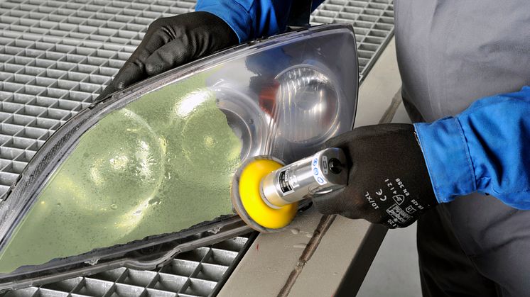 Börja med att rengöra strålkastaren för att ta bort grus och annan smuts. Slipa sedan med en oscillerande slipmaskin med 76 mm diameter och rondeller i korn 500 och därefter 800 som t.ex. Norton Pro. Använd rondellerna med ett skummellanlägg som ger följsammare slipning vilket är idealiskt för böjda ytor. Torka av ytan med en mikrofiberduk. Fortsätt sedan att våtslipa med rondeller i korn 1.500 och 3.000. Här rekommenderas rondeller med ett skumgummiskikt som t.ex. Norton Ice som ger en mjuk och följsam slipning och mycket fin yta. Skumgummiskiktet absorberar vatten och dammpartiklar och gör rondellen mycket följsam. När slipningen är klar rengör med en mikrofiberduk. Nu är det dags för nästa steg: