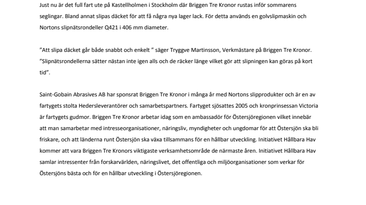 Saint-Gobain Abrasives AB har sponsrat Briggen Tre Kronor i många år med Nortons slipprodukter och är en av fartygets stolta Hedersleverantörer och samarbetspartners. Fartyget sjösattes 2005 och kronprinsessan Victoria är fartygets gudmor. Briggen Tre Kronor arbetar idag som en ambassadör för Östersjöregionen vilket innebär att man samarbetar med intresseorganisationer, näringsliv, myndigheter och ungdomar för att Östersjön ska bli friskare, och att länderna runt Östersjön ska växa tillsammans för en hållbar utveckling. Initiativet Hållbara Hav kommer att vara Briggen Tre Kronors viktigaste verksamhetsområde de närmaste åren. Initiativet Hållbara Hav samlar intressenter från forskarvärlden, näringslivet, det offentliga och miljöorganisationer som verkar för Östersjöns bästa och för en hållbar utveckling i Östersjöregionen.