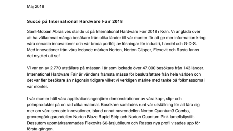 Saint-Gobain Abrasives ställde ut på International Hardware Fair 2018 i Köln. Vi är glada över att ha välkomnat många besökare från olika länder till vår monter för att ge mer information kring våra senaste innovationer och vår breda portfölj av lösningar för industri, handel och G-D-S. Med innovationer från våra ledande märken Norton, Norton Clipper, Flexovit och Rasta fanns det mycket att se!
