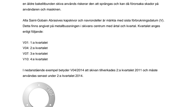 Alla Saint-Gobain Abrasives kapskivor och navrondeller är märkta med sista förbrukningsdatum (V). Detta finns angivet på metallbussningen i skivans centrum med årtal och kvartal. Kvartalet anges enligt följande: