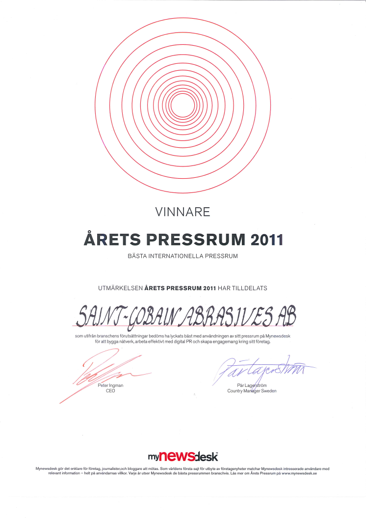 Saint-Gobain Abrasives har tilldelats utmärkelsen ”Årets Pressrum 2011” i kategorin Bästa Internationella Pressrum i en tävling som arrangeras av MyNewsdesk. Saint-Gobain Abrasives har idag pressrum på svenska, norska, danska, holländska och engelska.