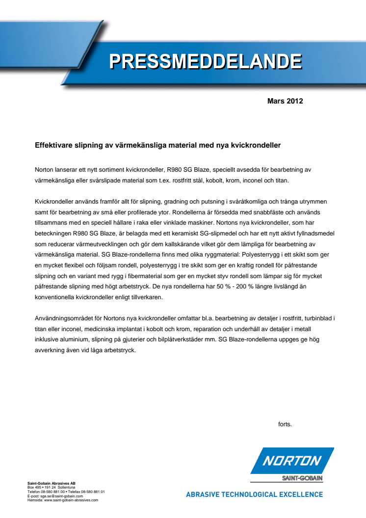 Norton lanserar ett nytt sortiment kvickrondeller, R980 SG Blaze, speciellt avsedda för bearbetning av värmekänsliga eller svårslipade material som t.ex. rostfritt stål, kobolt, krom, inconel och titan.