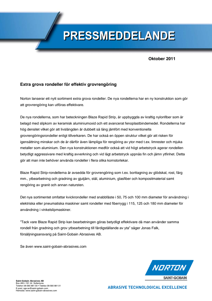 Norton lanserar ett nytt sortiment extra grova rondeller. De nya rondellerna, Blaze Rapid Strip, har en ny konstruktion som gör att grovrengöring kan utföras effektivare.