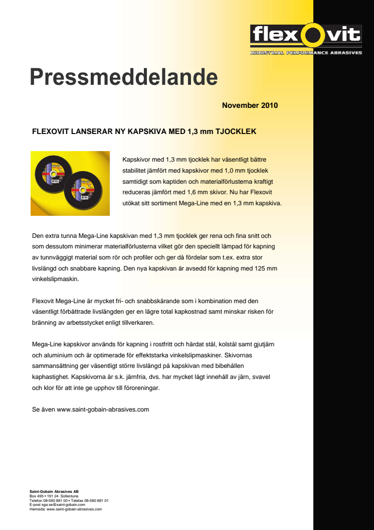 Kapskivor med 1,3 mm tjocklek har väsentligt bättre stabilitet jämfört med kapskivor med 1,0 mm tjocklek samtidigt som kaptiden och materialförlusterna kraftigt reduceras jämfört med 1,6 mm skivor. Nu har Flexovit utökat sitt sortiment Mega-Line med en 1,3 mm kapskiva.