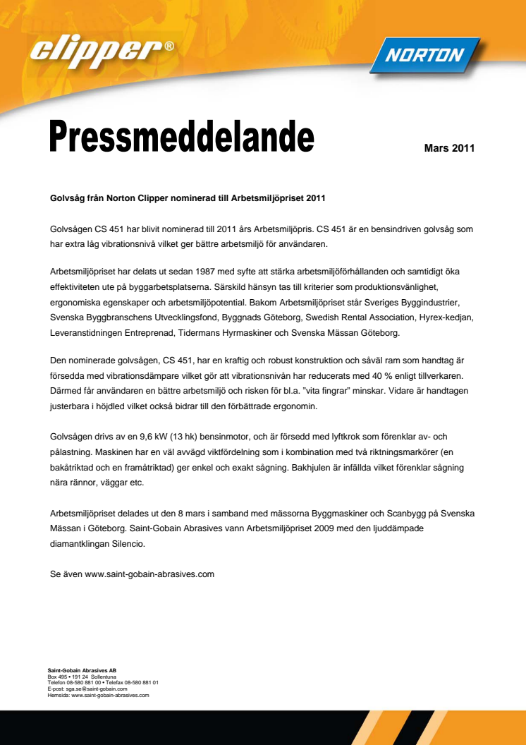 Golvsågen CS 451 från Norton Clipper har blivit nominerad till 2011 års Arbetsmiljöpris. CS 451 är en bensindriven golvsåg som har extra låg vibrationsnivå vilket ger bättre arbetsmiljö för användaren.