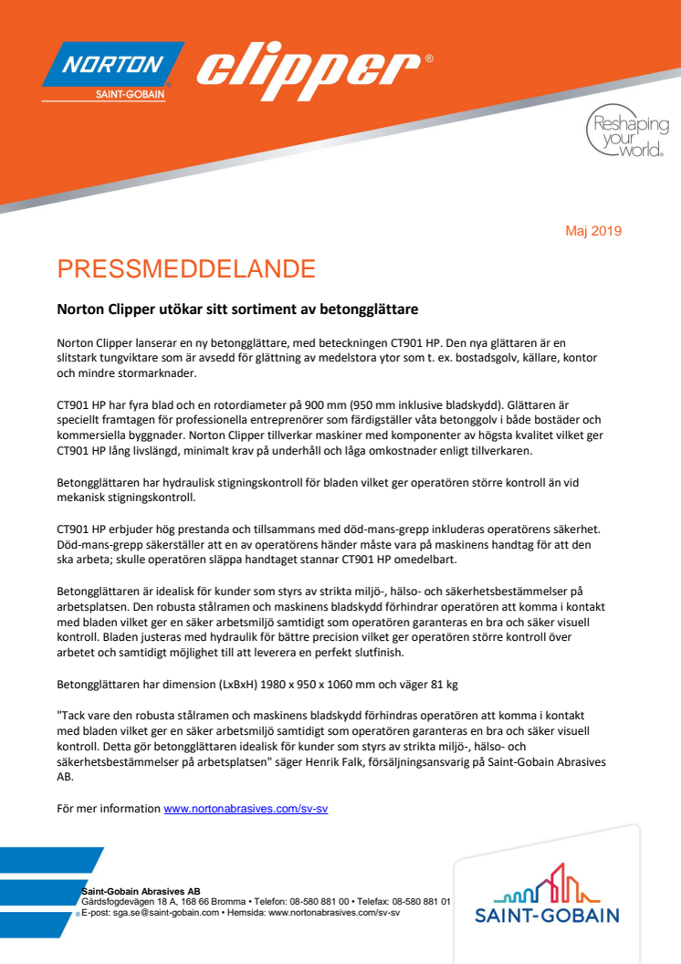 Norton Clipper lanserar en ny betongglättare, med beteckningen CT901 HP. Den nya glättaren är en slitstark tungviktare som är avsedd för glättning av medelstora ytor som t. ex. bostadsgolv, källare, kontor och mindre stormarknader