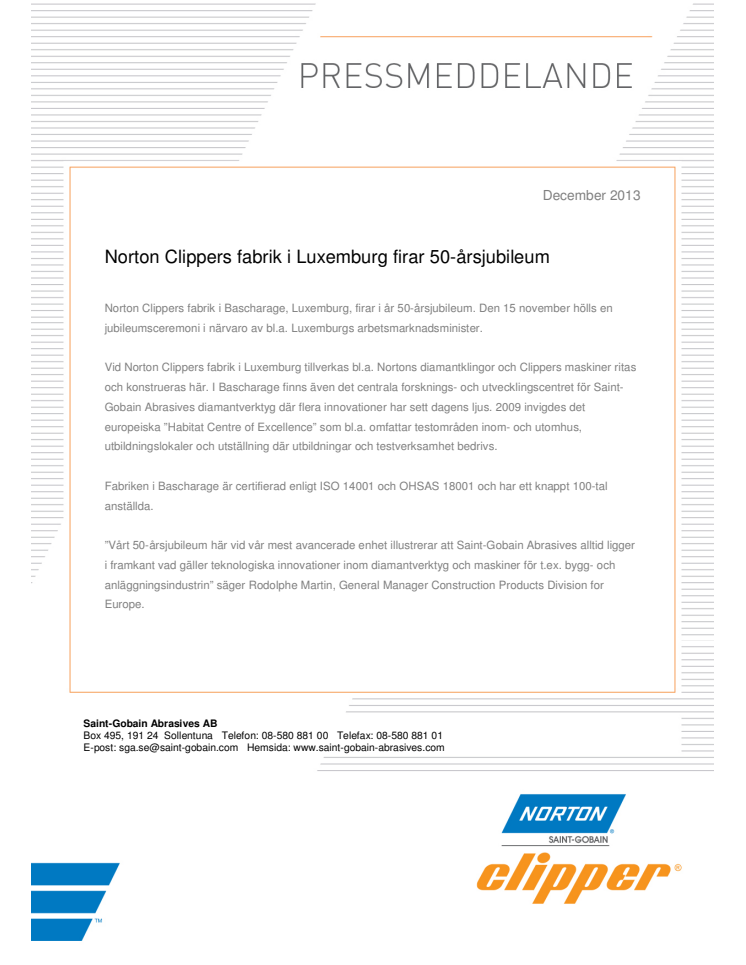 Norton Clippers fabrik i Bascharage, Luxemburg, firar i år 50-årsjubileum. Den 15 november hölls en jubileumsceremoni i närvaro av bl.a. Luxemburgs arbetsmarknadsminister.