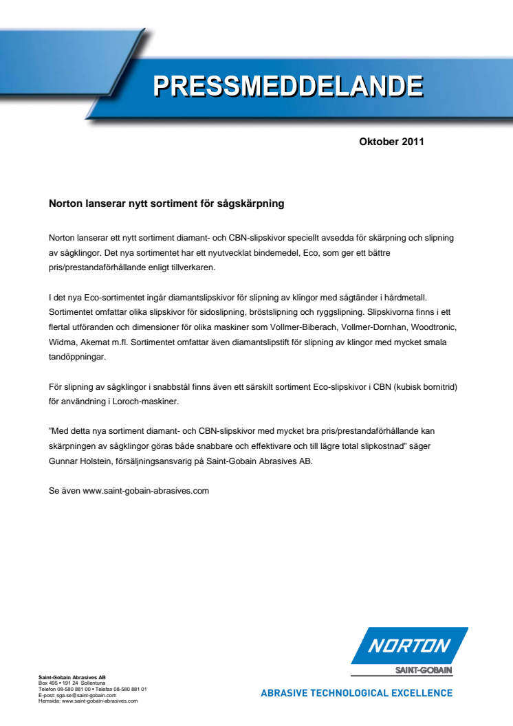 Norton lanserar ett nytt sortiment diamant- och CBN-slipskivor speciellt avsedda för skärpning och slipning av sågklingor. Det nya sortimentet har ett nyutvecklat bindemedel, Eco, som ger ett bättre pris/prestandaförhållande.