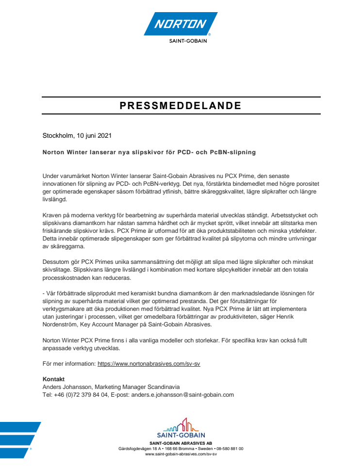 Under varumärket Norton Winter lanserar Saint-Gobain Abrasives nu PCX Prime, den senaste innovationen för slipning av PCD- och PcBN-verktyg. Det nya, förstärkta bindemedlet med högre porositet ger optimerade egenskaper såsom förbättrad ytfinish, bättre skäreggskvalitet, lägre slipkrafter och längre livslängd.