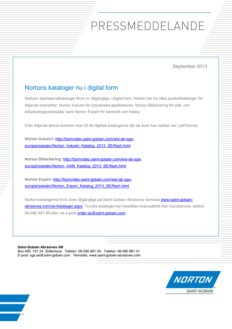 Nortons slipmaterialkataloger finns nu tillgängliga i digital form. Norton har tre olika produktkataloger för följande branscher: Norton Industri för industriella applikationer, Norton Billackering för plåt- och billackeringsverkstäder samt Norton Expert för hantverk och hobby.