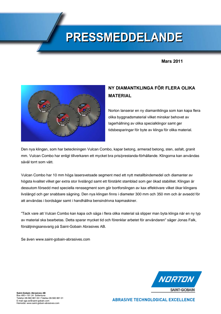 Norton lanserar en ny diamantklinga som kan kapa flera olika byggnadsmaterial vilket minskar behovet av lagerhållning av olika specialklingor samt ger tidsbesparingar för byte av klinga för olika material. Den nya klingan, som har beteckningen Vulcan Combo, kapar betong, armerad betong, sten, asfalt, granit mm.