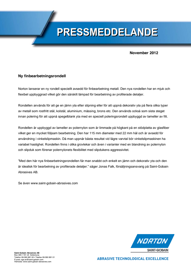 Norton lanserar en ny rondell speciellt avsedd för finbearbetning metall. Den nya rondellen har en mjuk och flexibel uppbyggnad vilket gör den särskilt lämpad för bearbetning av profilerade detaljer.