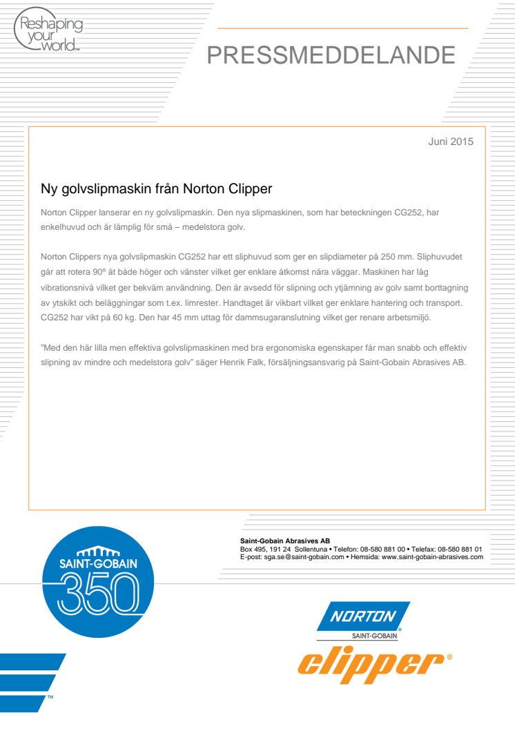 Norton Clipper lanserar en ny golvslipmaskin. Den nya slipmaskinen, som har beteckningen CG252, har enkelhuvud och är lämplig för små – medelstora golv.