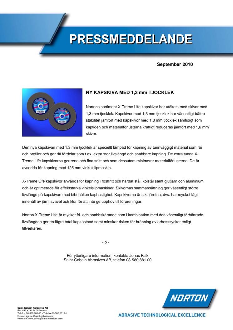 Nortons sortiment X-Treme Life kapskivor har utökats med skivor med 1,3 mm tjocklek. Kapskivor med 1,3 mm tjocklek har väsentligt bättre stabilitet jämfört med kapskivor med 1,0 mm tjocklek samtidigt som kaptiden och materialförlusterna kraftigt reduceras jämfört med 1,6 mm skivor.