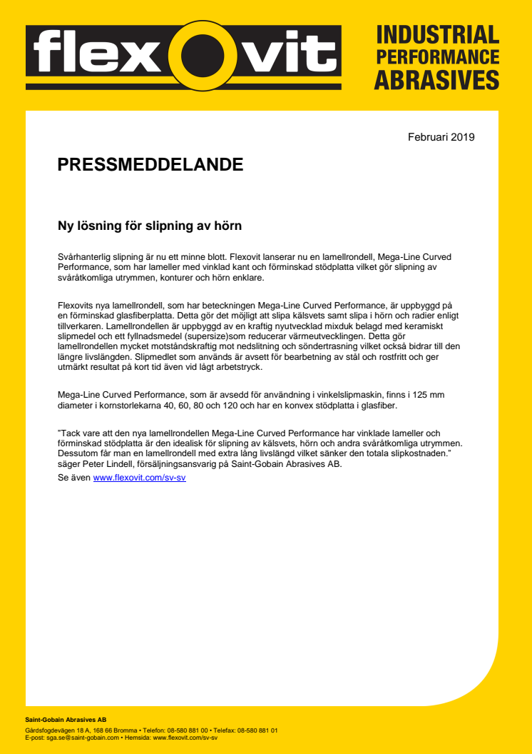 Svårhanterlig slipning är nu ett minne blott. Flexovit lanserar nu en lamellrondell, Mega-Line Curved Performance, som har lameller med vinklad kant och förminskad stödplatta vilket gör slipning av svåråtkomliga utrymmen, konturer och hörn enklare.