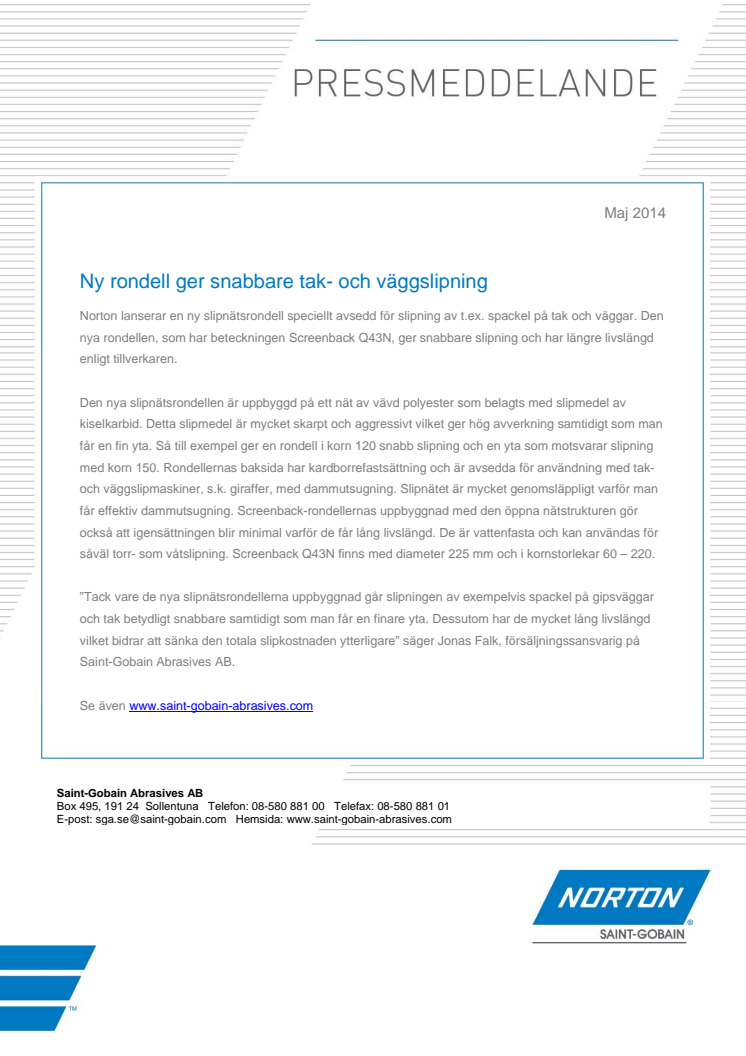 Norton lanserar en ny slipnätsrondell speciellt avsedd för slipning av t.ex. spackel på tak och väggar. Den nya rondellen, som har beteckningen Screenback Q43N, ger snabbare slipning och har längre livslängd enligt tillverkaren.
