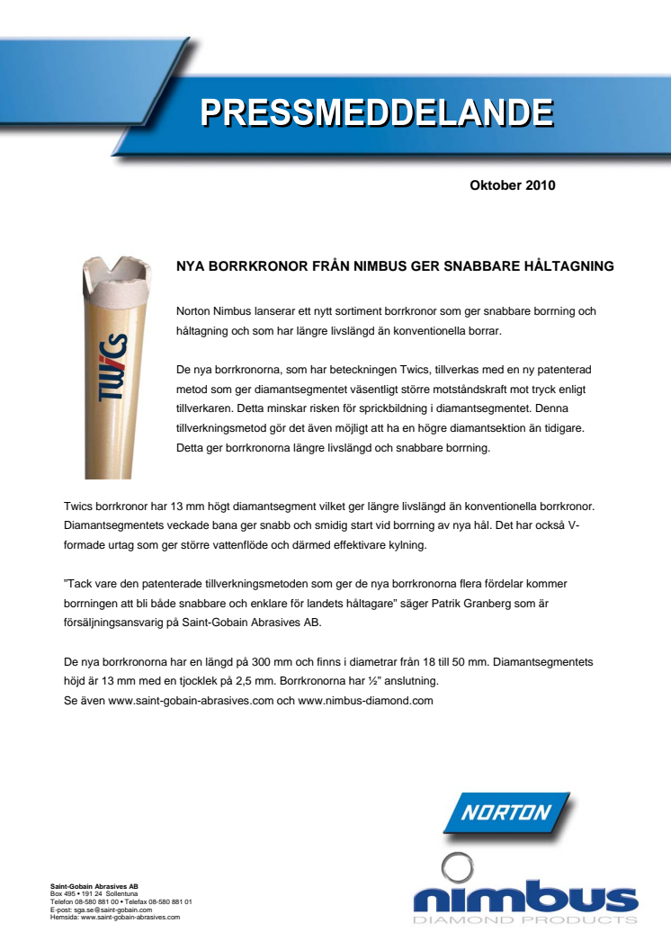 Norton Nimbus lanserar ett nytt sortiment borrkronor som ger snabbare borrning och håltagning och som har längre livslängd än konventionella borrar.