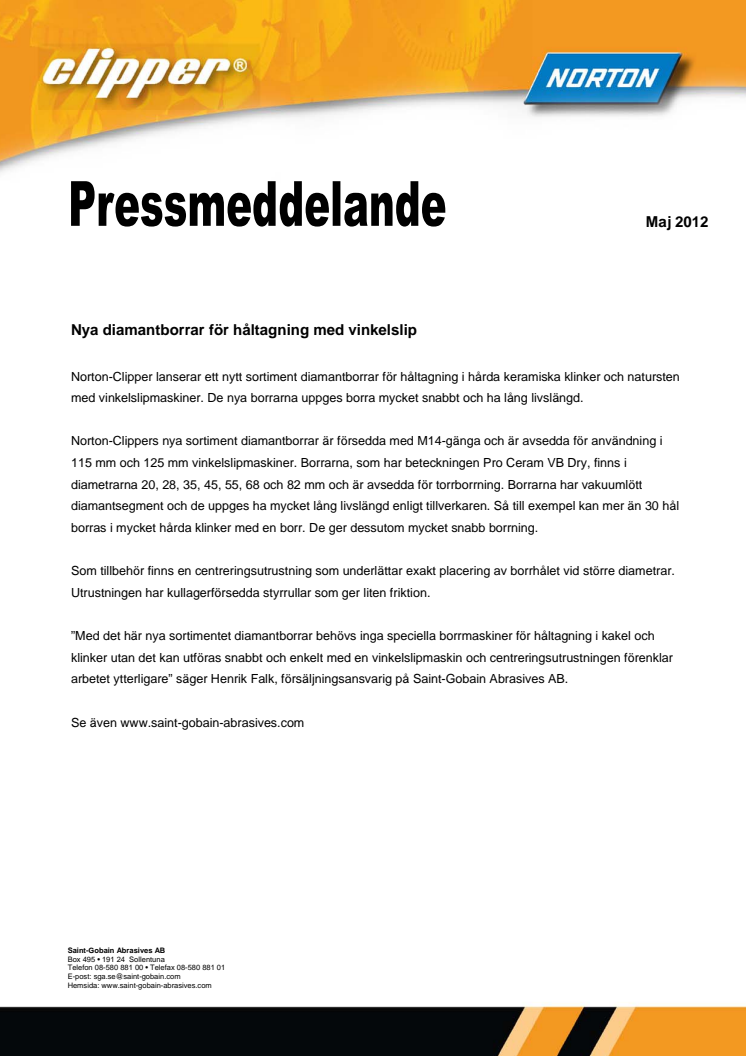 Norton-Clipper lanserar ett nytt sortiment diamantborrar för håltagning i hårda keramiska klinker och natursten med vinkelslipmaskiner. De nya borrarna uppges borra mycket snabbt och ha lång livslängd.