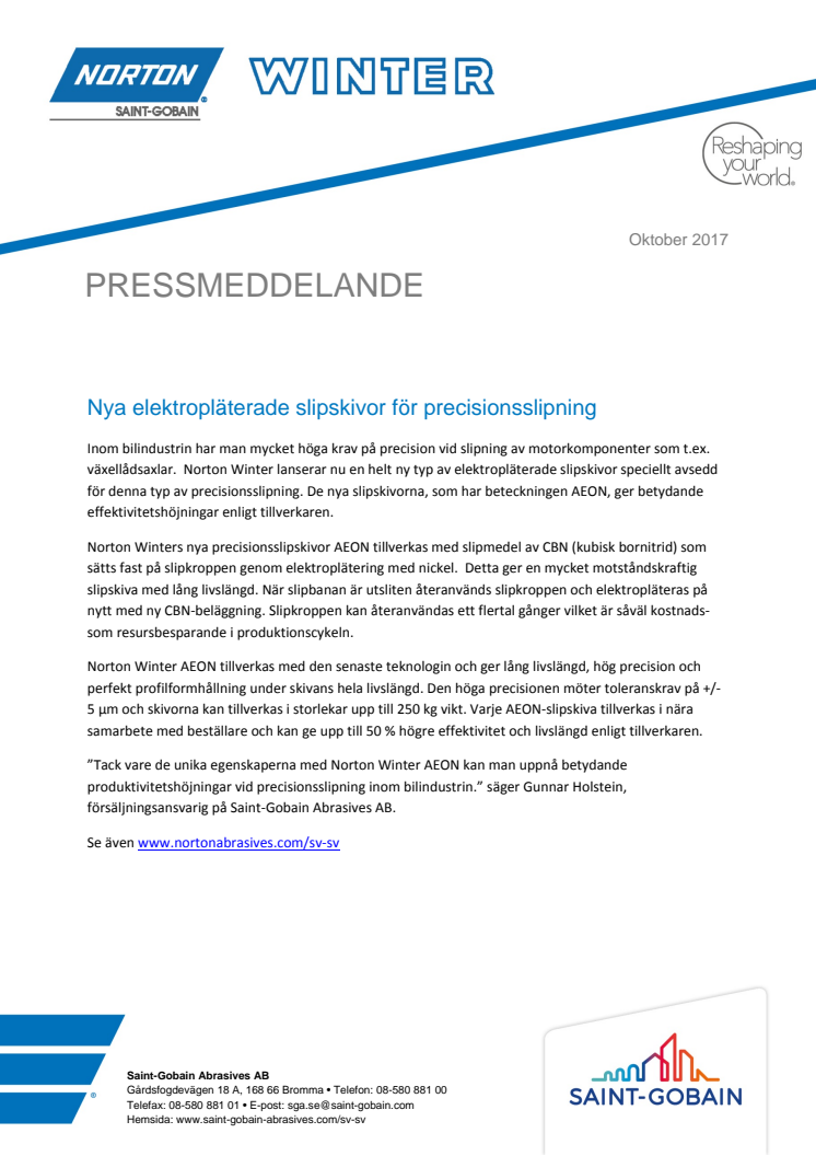Inom bilindustrin har man mycket höga krav på precision vid slipning av motorkomponenter som t.ex. växellådsaxlar. Norton Winter lanserar nu en helt ny typ av elektropläterade slipskivor speciellt avsedd för denna typ av precisionsslipning.