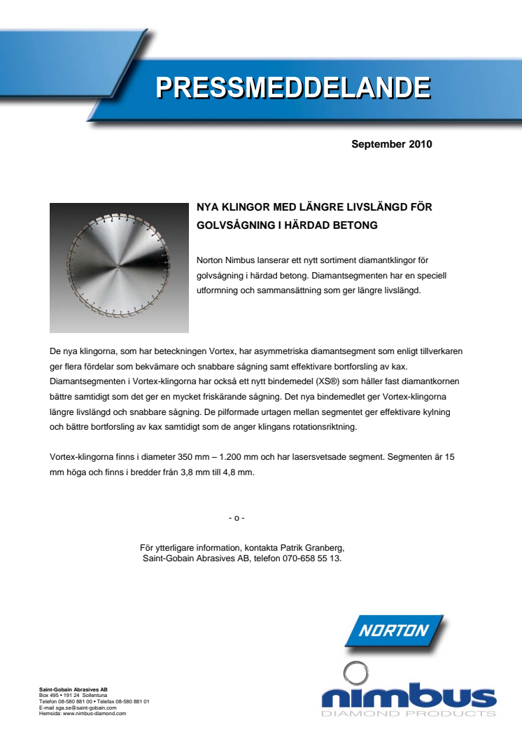 Norton Nimbus lanserar ett nytt sortiment diamantklingor för golvsågning i härdad betong. Diamantsegmenten har en speciell utformning och sammansättning som ger längre livslängd.