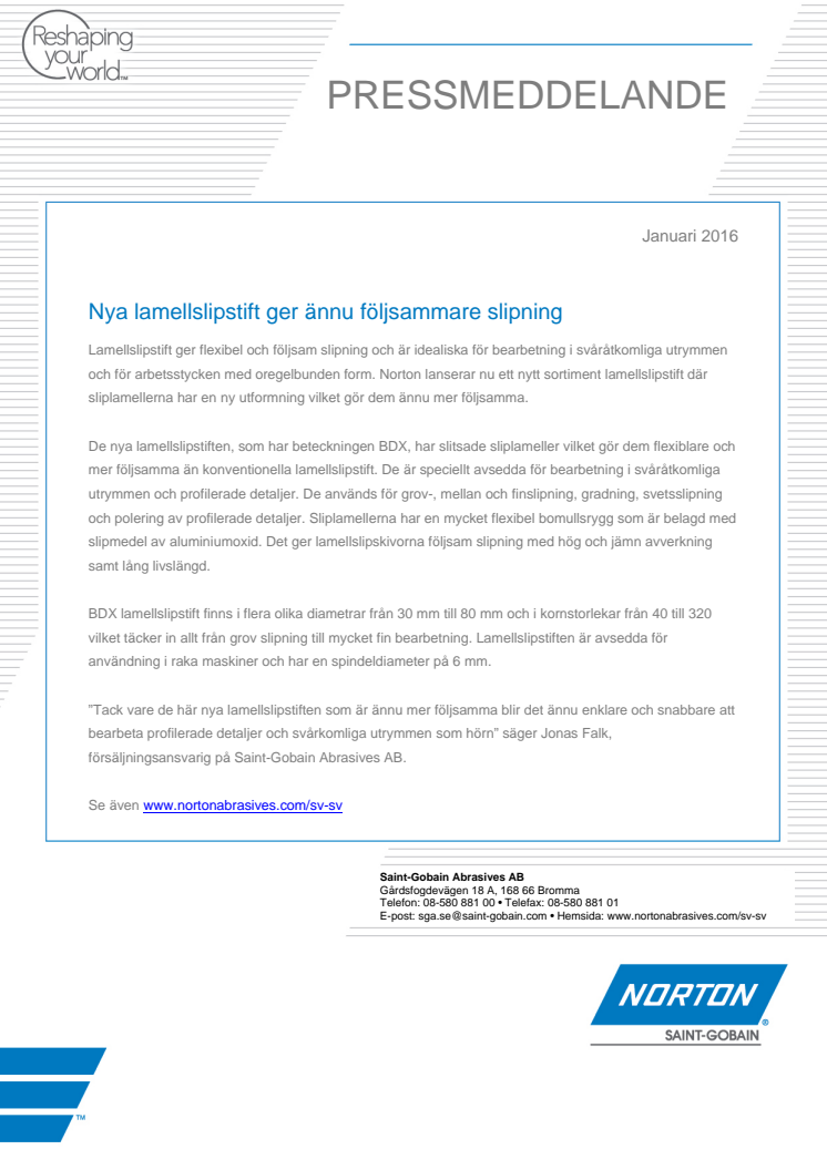Lamellslipstift ger flexibel och följsam slipning och är idealiska för bearbetning i svåråtkomliga utrymmen och för arbetsstycken med oregelbunden form. Norton lanserar nu ett nytt sortiment lamellslipstift där sliplamellerna har en ny utformning vilket gör dem ännu mer följsamma.