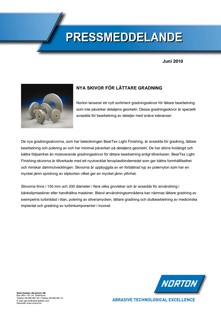 Norton lanserar ett nytt sortiment gradningsskivor för lättare bearbetning som inte påverkar detaljens geometri. Dessa gradningsskivor är speciellt avsedda för bearbetning av detaljer med snäva toleranser.