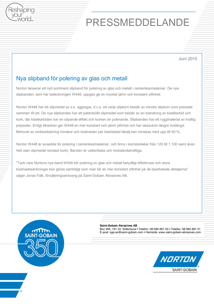 Norton lanserar ett nytt sortiment slipband för polering av glas och metall i centerlessmaskiner. De nya slipbanden, som har beteckningen W448, uppges ge en mycket jämn och konstant ytfinhet.