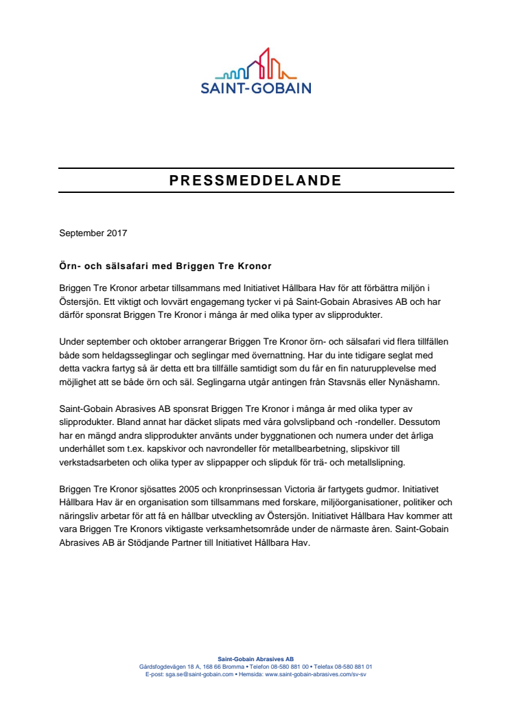 Briggen Tre Kronor arbetar tillsammans med Initiativet Hållbara Hav för att förbättra miljön i Östersjön. Ett viktigt och lovvärt engagemang tycker vi på Saint-Gobain Abrasives AB och har därför sponsrat Briggen Tre Kronor i många år med olika typer av slipprodukter. Under september och oktober arrangerar Briggen Tre Kronor örn- och sälsafari vid flera tillfällen.
