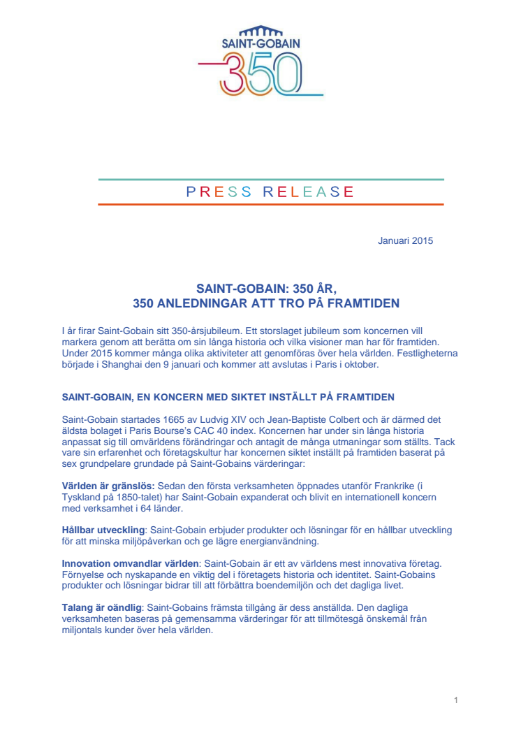 I år firar Saint-Gobain sitt 350-årsjubileum. Ett storslaget jubileum som koncernen vill markera genom att berätta om sin långa historia och vilka visioner man har för framtiden. Under 2015 kommer många olika aktiviteter att genomföras över hela världen. Festligheterna började i Shanghai den 9 januari och kommer att avslutas i Paris i oktober.