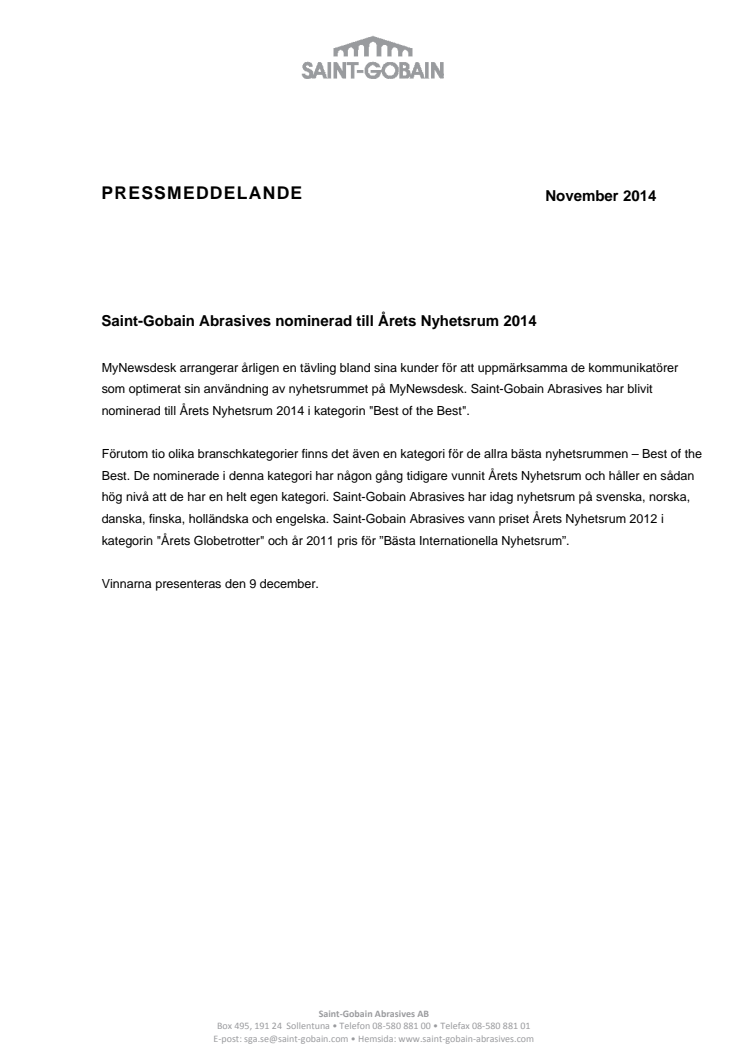 MyNewsdesk arrangerar årligen en tävling bland sina kunder för att uppmärksamma de kommunikatörer som optimerat sin användning av nyhetsrummet på MyNewsdesk. Saint-Gobain Abrasives har blivit nominerad till Årets Nyhetsrum 2014 i kategorin "Best of the Best".