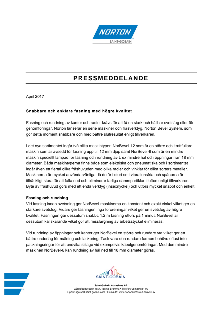 Fasning och rundning av kanter och radier krävs för att få en stark och hållbar svetsfog eller för genomföringar. Norton lanserar en serie maskiner och fräsverktyg, Norton Bevel System, som gör detta moment snabbare och med bättre slutresultat enligt tillverkaren.