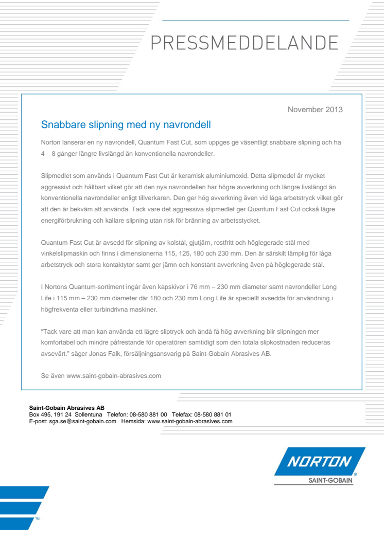 Norton lanserar en ny navrondell, Quantum Fast Cut, som uppges ge väsentligt snabbare slipning och ha 4 – 8 gånger längre livslängd än konventionella navrondeller.