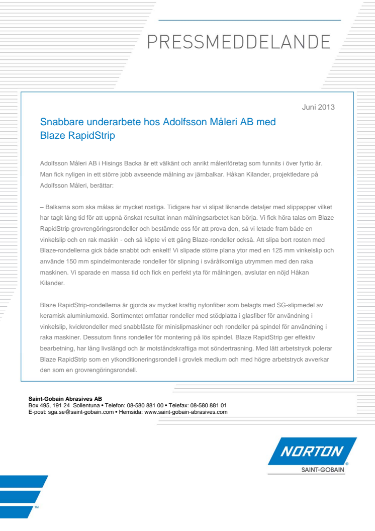 Adolfsson Måleri AB i Hisings Backa är ett välkänt och anrikt måleriföretag som funnits i över fyrtio år. Man fick nyligen in ett större jobb avseende målning av järnbalkar. Balkarna som ska målas var mycket rostiga. För att slipa bort rosten användes Blaze RapidStrip rondeller vilket gick både snabbt och enkelt.