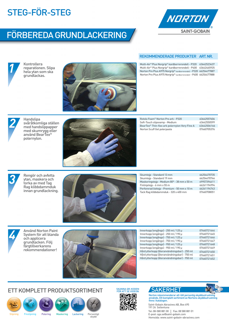 Norton har ett komplett slip- och polersortiment för billackeringsverkstäder. I sortimentet ingår bl.a. sliprondeller, ark i polernylon och maskeringstejp som används för att förbereda grundlackering. Hur produkterna används framgår av denna steg-för-steg-instruktion.