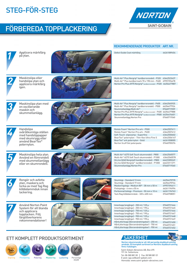 Norton har ett komplett slip- och polersortiment för billackeringsverkstäder. I sortimentetn ingår bl.a. sliprondeller, polerpasta och klibbdammdukar som används för att förbereda topplackering. Hur produkterna används framgår av denna steg-för-steg-instruktion.