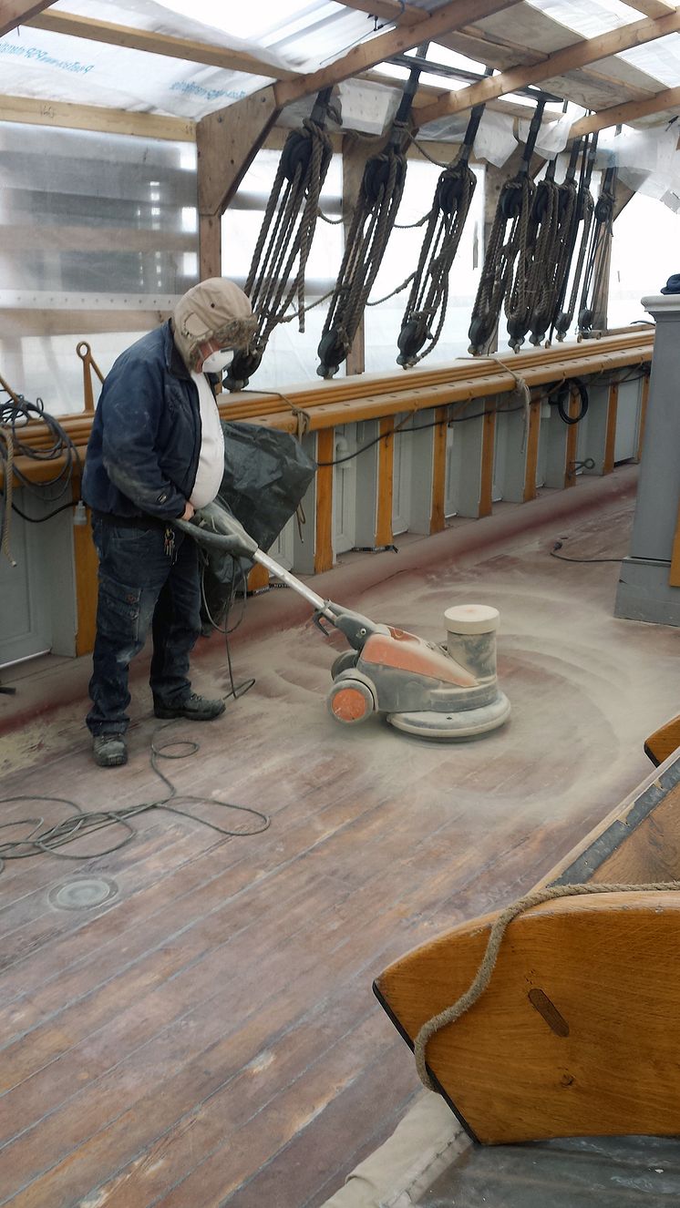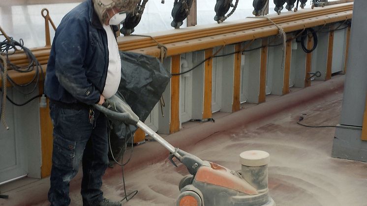 Verkmästare Martinsson på Briggen Tre Kronor slipar däcket med en golvslipmaskin med van hand.