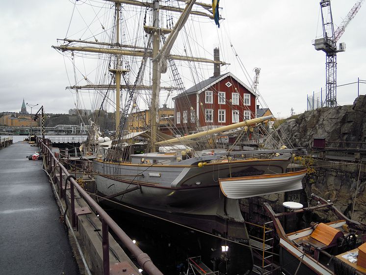 Just nu ligger Briggen Tre Kronor i en av torrdockorna på Beckholmen i Stockholm för översyn och underhållsarbeten under vattenlinjen.