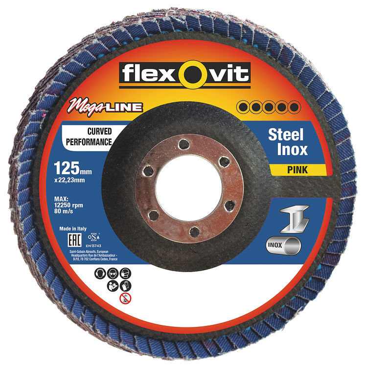 Mega-Line Curved Performance, som är avsedd för användning i vinkelslipmaskin, finns i 125 mm diameter i kornstorlekarna 40, 60, 80 och 120 och har en konvex stödplatta i glasfiber.