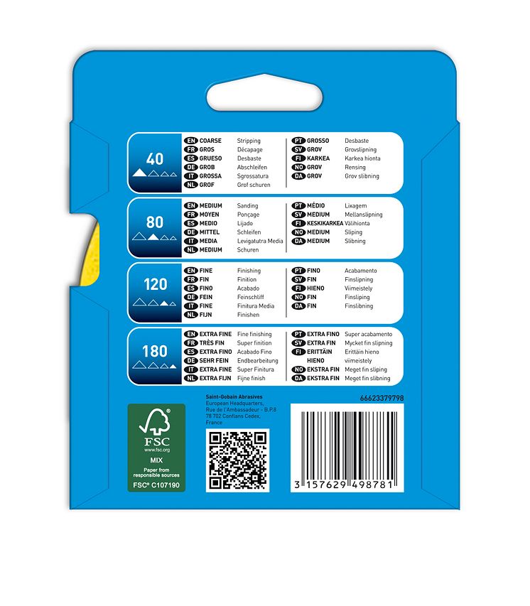 Saint-Gobain Abrasives är den första slipmaterialtillverkaren som säljer FSC-certifierade produkter och redan idag finns ett flertal FSC-certifierade slipprodukter i Saint-Gobain Abrasives sortiment. De certifierade produkterna är märkta med FSC-logotypen på förpackningen och specifikationen som trycks på pappersryggens baksida har tillägget ”F” (t.ex. G131F).