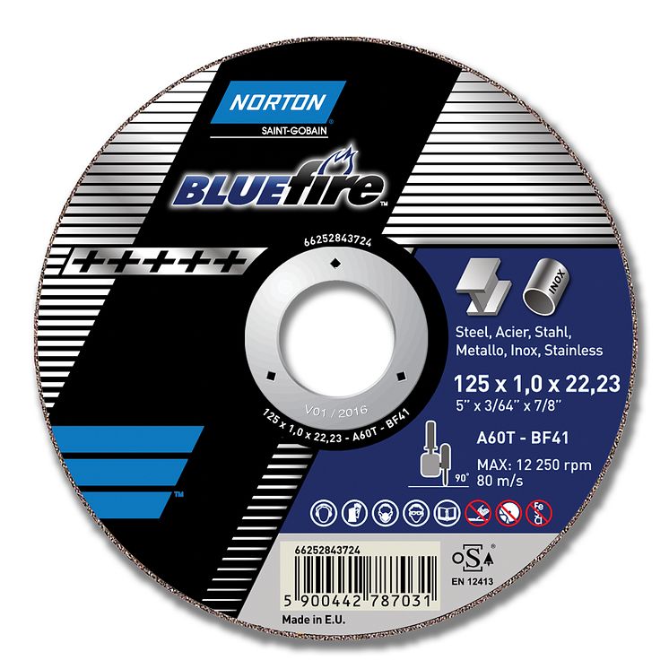 Norton Blue Fire kapskivor och navrondeller är avsedda för metallbearbetning som t.ex. bortslipning av svetsar, ytbearbetning, formning, kapning, borttagning av rostiga etc. Kapskivorna finns i 50, 63, 76 och 100 mm diameter för användning i raka maskiner och i 115 och 125 mm för användning i vinkelslipmaskiner. Navrondellerna är avsedda för användning i 115 eller 125 mm vinkelslipmaskin.