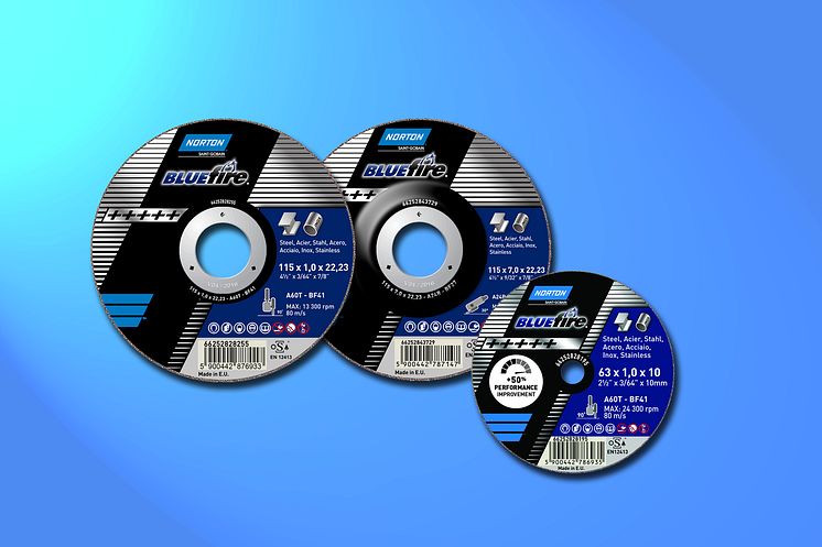 Nortons Blue Fire kapskivor och navrondeller har en nyutvecklad sammansättning som ger längre livslängd samt snabbare kapning och slipning. Dessutom är de kallskärande vilket eliminerar blånader samt ger fina och rena snitt fria från grader vilket minimerar tidsödande efterbearbetning.