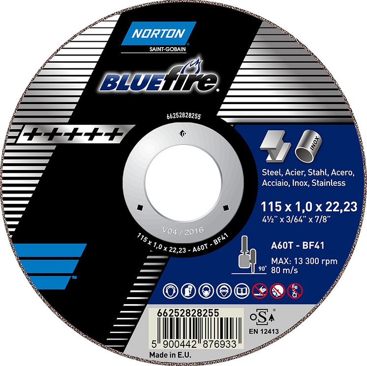 I Nortons Blue Fire-sortiment ingår även 115 och 125 mm kapskivor för vinkelslipmaskiner för metallbearbetning som t.ex. kapning och borttagning av rostiga eller korroderade karossdelar.