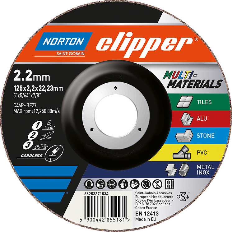 Norton Clipper Multi-Material navrondeller finns i diameter 115 och 125 mm och har 2,2 mm tjocklek vilket innebär att de kan användas för kapning, slipning och polering.