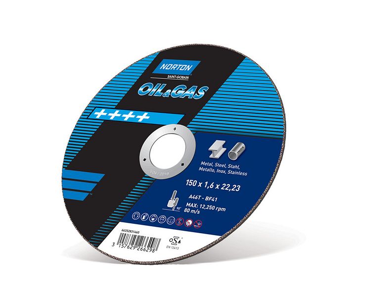 Nortons kapskivor Oil & Gas finns i diameter 115 mm – 230 mm och i olika tjocklekar från 1,0 – 2,5 mm och navrondellerna för slipning i 115 mm – 230 mm diameter i tjocklek 4 mm (för fogberedning, slipning och även kapning) samt 7 mm (för slipning).