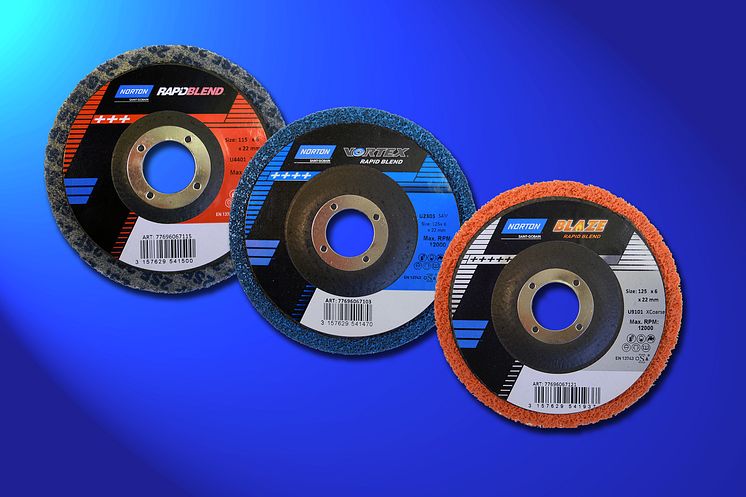 Nortons nya sortiment ytkonditioneringsrondeller Rapid Blend för vinkelslipmaskiner har en tjocklek på endast 6 mm vilket gör dem speciellt lämpliga för bearbetning i svåråtkomliga utrymmen. De är monterade på en stödplatta av glasfiber och finns i 115 och 125 mm diameter. Tack vare att de är så tunna minskas också vibrationsnivån vilket ger bättre arbetsförhållanden.