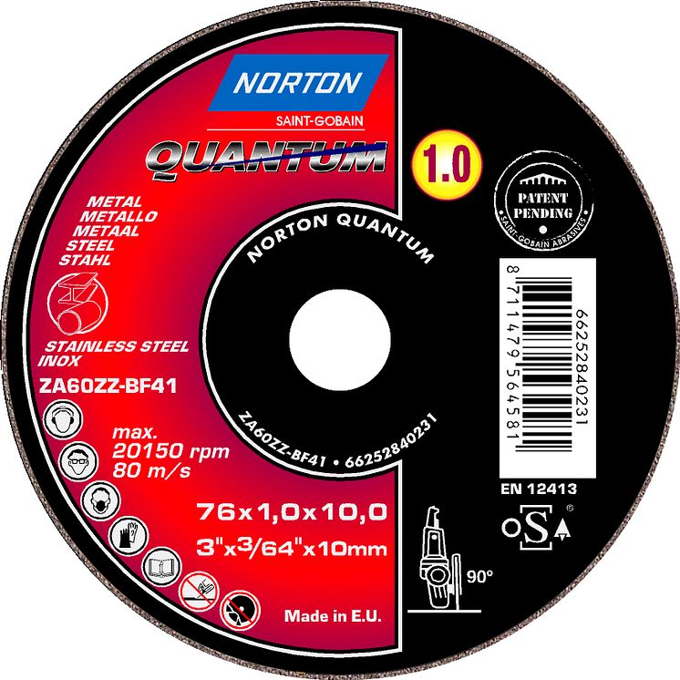 Norton lanserar en ny kapskiva speciellt avsedd för kapning i bilplåt. Den nya kapskivan, Norton Quantum, har 76 mm diameter och är första hand är avsedd att användas i raka pneumatiska maskiner för kapning i plåt och andra tunnare material.