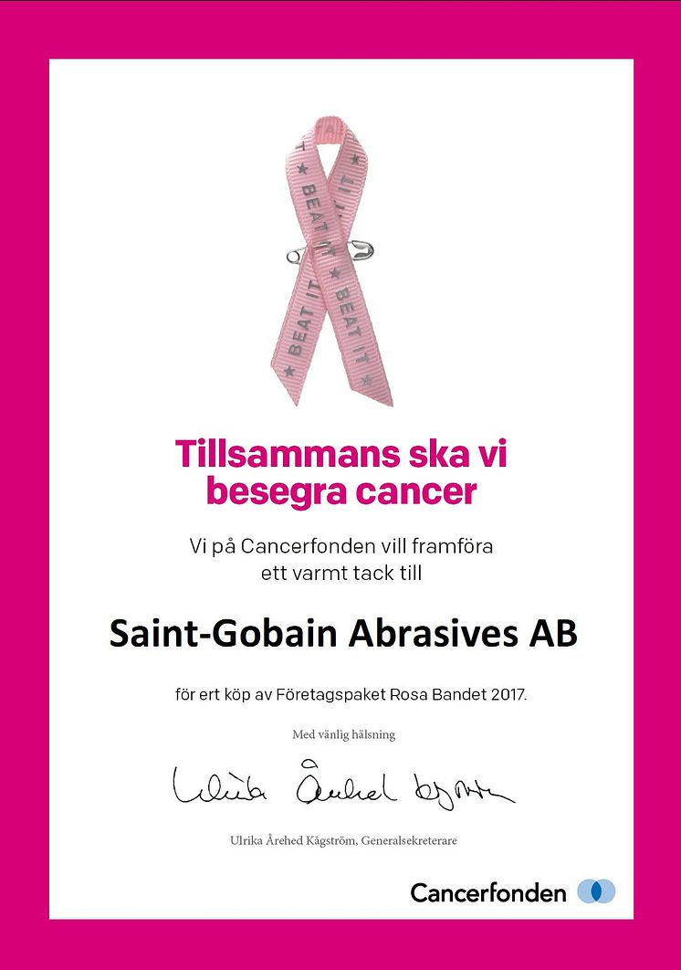 Saint-Gobain Abrasives AB stödjer även i år Cancerfondens kampanj Rosa Bandet vars syfte är att finansiera forskning och sprida kunskap om cancerprevention och bröstcancer.